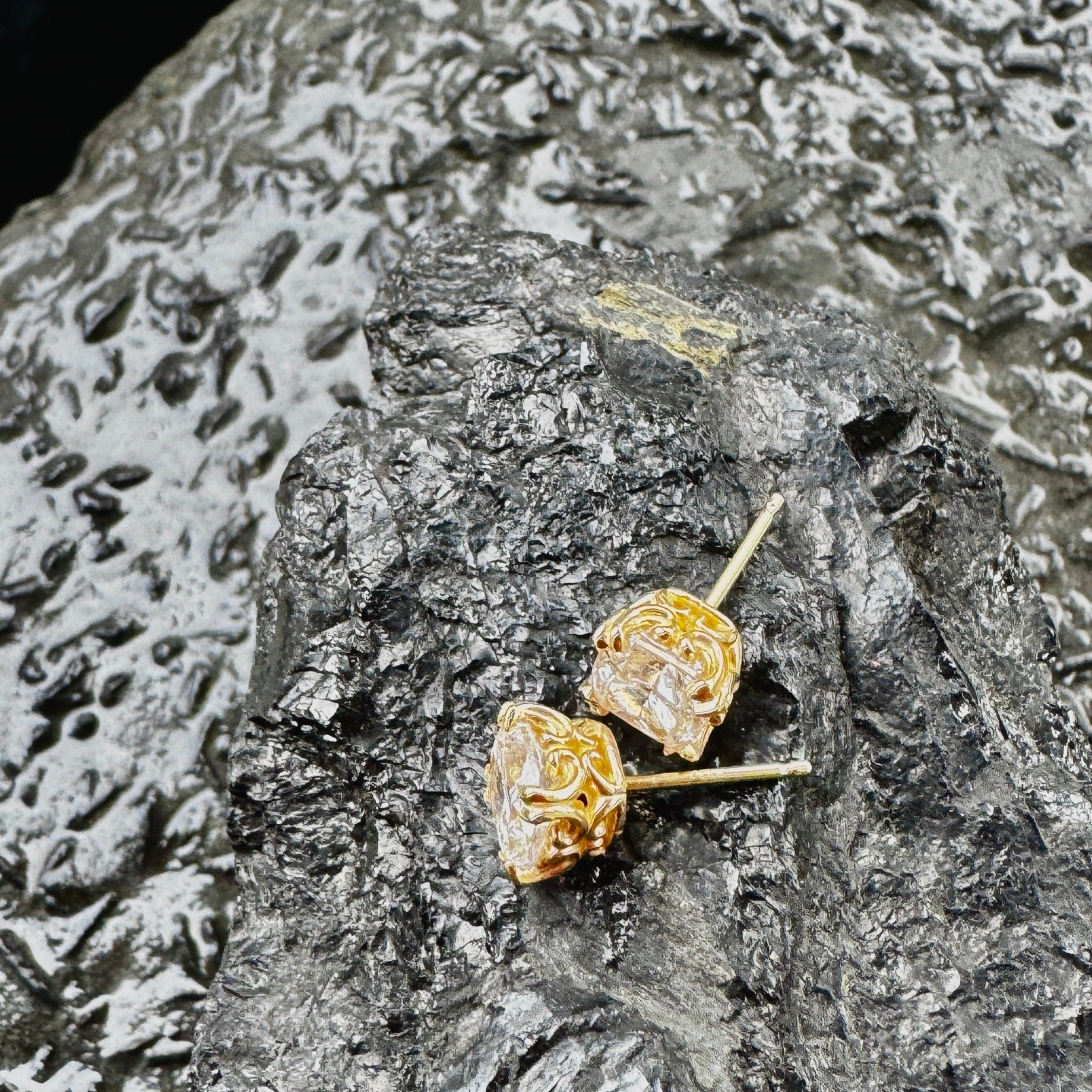 These quiet beauties are evocative of a romantic time... an old cut that's set in a vintage-style 14KY setting: double prongs at the corners which curve into scrolls that perfectly complement cushion cut diamonds with a total weight of 1.95 carats.